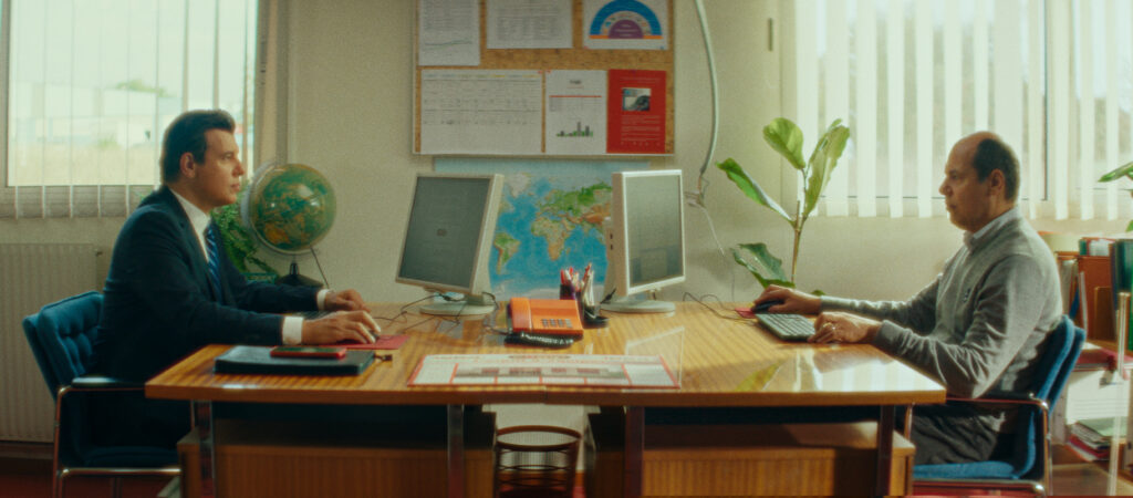 Détail important, Alex est le seul (avec le spectateur) à constater l’effet de gémellité. Ce canevas, qui rappelle La Moustache d’Emmanuel Carrère (un homme se rase la dite moustache, et personne ne le remarque ni même ne se souvient l’avoir vue un jour), constitue le terrain de paranoïa et d’abandon parfait, propice aux jeux de perception troublée. Alex est d’ailleurs pris en position de voyeur, qui observe ce qu’il y a de « mieux » de l’autre côté de la haie, depuis la cabane en plastique du jardin ou de la fenêtre de sa chambre (qui souligne bien les limites enfantines de son espace mental), équipé de jumelles et d’un casque amplificateur de bruit. Mais que voit-il, au fond ? Que son voisin fait tout mieux que lui, mais l’air de rien, avec gentillesse. Conclusion : ça le rend fou. Ce point de vue fonctionne comme un catalyseur de frustration trop évident (je vois qu’il est mieux que moi), sans jamais dépasser le simple constat dépréciatif, et aller creuser, justement, ce qui perturbe sa propre existence. La psychose qui se forme dans l’esprit d’Alex s’engouffre alors dans des théories conspirationnistes détachées du trouble originel. Les plans du début, où celui-ci observe son voisin depuis chez lui, le laissant à l’état d’image indéfinie, s’effacent trop rapidement : Axel s’approche, franchit le palier, et il ne s’agit dès lors plus de prendre le pouls de cet écart entre l’un et l’autre (Axel fonctionne-t-il comme une projection fantasmée ou au contraire un état révolu?). Reste une machination étirée et convenue, faite d’allers et venues entre la COGIP (nom de leur employeur, déjà celui de l’entreprise de Message à caractère informatif) et le foyer, pour gratter le vernis des cadres de province qui cachent des esclaves asiatiques dans leur cave. Au contraire de Bugonia, qu’il rappelle étrangement dans son dernier mouvement, avec son héros dont il ne s’agit plus de savoir s’il a raison ou se trouve à côté de la plaque, Alter ego ne vient pas réellement bousculer les corps et leur logique d’assujettissement.