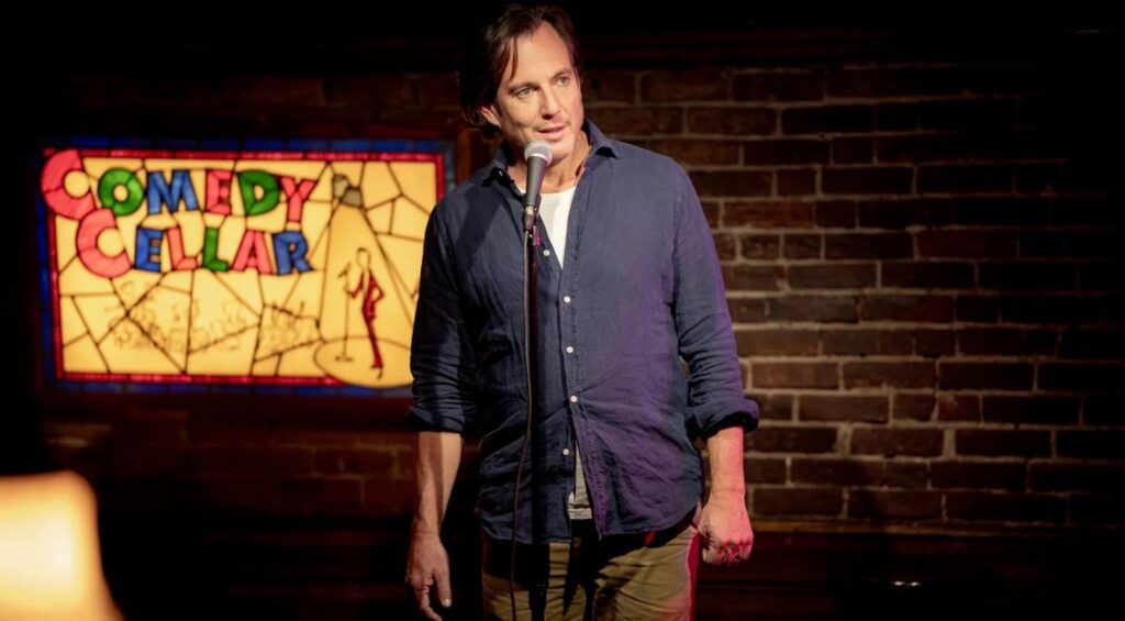 Alex Novak (Will Arnett, qui trouve un magnifique rôle à sa mesure comique) le confesse à son épouse Tess (Laura Dern, gouailleuse ce qu’il faut) tandis qu’ils se lavent les dents, « On arrête non ? ». La rupture ne part pas du conflit, de la dispute, mais d’un essoufflement que l’on constate à deux dans le miroir. La fiction conjugale, et possiblement chaotique, est déjà passée. Alex et Tess ont sans doute essayé de se rabibocher, tant que faire se peut, s’engueulant parfois, certainement. Ne reste qu’à quitter le réconfort et la douceur de la maison de famille bourgeoise de la banlieue new-yorkaise, les enfants et les chiens qui se posent sur vous pour dormir et vous réchauffent, pour un petit appartement où Alex dort sur le canapé pour accueillir ses deux fils. Il faut s’habituer à s’extraire d’une routine, comme Alex s’en rend compte sur le quai d’un métro, en sortant in extremis car ne rentrant pas avec son ex-femme. S’extraire et se relancer dans un espace à la marge du foyer (de l’appartement d’Alex au grenier d’une maison d’amis), de sa douceur qui a tout d’un piège. D’un côté Tess qui, si elle ne peut reprendre sa carrière de volleyeuse internationale, nourrie le désir d’intégrer le staff de la team USA (posture d’observatrice en retrait) ; de l’autre, et avant tout, Alex qui, pour ne pas avoir à payer un verre un soir, se lance dans le stand-up. Los Angeles 2028 et les clubs souterrains nocturnes, deux horizons qui par leur logique de mouvement (la comédie et le sport) relancent la monotonie amoureuse. L’image conjugale est extraite du cadre pour être secouée – Alex se sert de sa vie privée, mais pas à des fins de défouloir (au contraire de la réjouissante Mme Maisel). C’est justement la plongée dans la ville qui fait advenir les retrouvailles entre époux, lorsque leur réalité matrimoniale (dans un sketch d’Alex auquel Tess assiste par hasard) prend le devant de la scène.