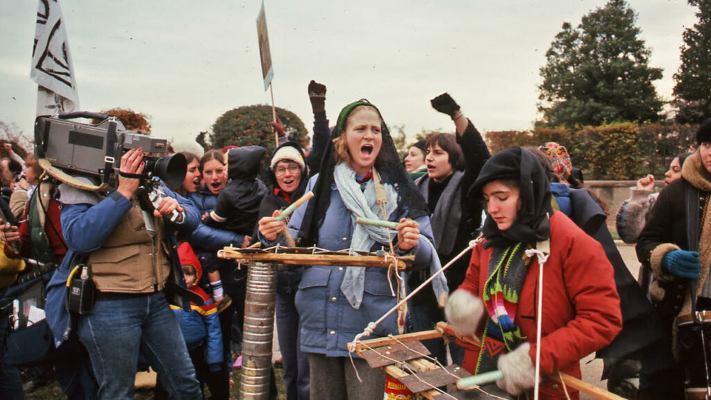 Au contraire, With Love and Rage de Bojina Panoyotova, si l’on n’y parle pas au sens propre du terme hormis pour citer les grandes autrices féministes de l’époque, excelle par sa structuration d’une parole collective composée de documents épars relatant des événements survenus à Washington en 1980 : une manifestation féministe contre le Pentagone, au moment où Ronald Reagan appelle à réarmer le pays. Film d’archives dont le montage s’appuie sur une composition sonore réalisée en amont du montage d’images, With Love and Rage fait siens les matériaux produits lors de la manifestation : des marionnettes en carton-pâte, des photographies, des chansons folks et des films. Le projet a évidemment pour ambition la constitution d’un corpus d’œuvres réalisées par des artistes jusqu’alors inconnues. Mais cette approche multimédia se croise avec un récit à la première personne qui se déploie à l’écrit : d’où une certaine immersion qui se dégage d’une cohérence non pas imposée, mais produite par de fluides associations entre les matériaux. Car la voix qu’on lit n’est pas l’expression d’une seule, mais un collage qui, comme le film dans son ensemble, produit une polyphonie. Et c’est bien là la force du travail de recherches mené par Bojina Panayotova, qui traduit les divergences, les convergences, en clair toute la complexité des mouvements féministes de l’époque. With Love and Rage est un film sans paroles, mais bien un film parlant.
