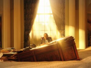 À vrai dire, inutile de distinguer entre l’horreur de l’un ou de l’autre (le système Brad Pitt ou le système Formule 1) : ce qui m’a sidéré c’est qu’ils avancent de concert, frontalement. La réception critique approbatrice ou pour le moins conciliante n’est, en ce sens, pas un moindre dommage. Il y a bien quelques promesses disséminées ici ou là. Lorsque Pitt et Kerry Condon échangent parce que lui, beauf obtus à souhait, rit bêtement de son usage du vélo à elle, pourtant designer des véhicules à la pointe la plus acérée de la technologie, elle réplique avec assurance « mon travail, c’est le vent ». Un instant, j’ai naïvement espéré assister à un film bachelardien, songeant en sous-main à la vitesse et aux courbes, au dialogue des matériaux graciles et des éléments imprévisibles, raccordant l’ingénierie à un travail de la rêverie sensorielle. Malheureusement ce goût pour le vent semble plutôt être un bref trait de caractérisation, le don d’une féminité légère, intuitive, soufflant dans un sens naturel. Plus tard, Pitt, ce beau-joueur, ce sur-joueur (son rapport transgressif aux règles sportives, aux frontières de l’illicite, donne l’impression qu’il est doté d’un rayon de perception omnisciente qu’il balaie à sa guise sur le circuit – proprement nanardesque), couchera avec elle à la suite d’une partie de poker magistralement conduite puis la délaissera sans heurt aucun. Ce bref dialogue venteux est aussi une façon d’introduire aux visions fétichisées des technologies des laboratoires de conception. Le très lourd cadre des processus décisionnaires, des verrous administrativo-financiers et marketing y est miraculeusement dissous, rendu à la pure force de l’intellect concepteur accouplé à sa machine. On voit comment ce fantasme de la souplesse technologique, que le film érige en principe exclusif d’organisation du travail, peut glisser sans peine vers un désir assumé pour l’industrie de l’armement : merveille des bombes véloces et légères conçues par les ingénieurs américains, n’est-ce-pas. En ce sens, le moment le plus glaçant arrive lorsque Pitt, concluant avec désinvolture une réunion de travail hautement tactique et protocolaire, meugle un sommaire « combat » dans son micro. Conséquence immédiate : l’ensemble de la dizaine des « collaborateurs » de son écurie tapent du poing sur la table en scandant son mantra guerrier. Je crois que c’est un film auquel une lecture paranoïaque s’applique bien.