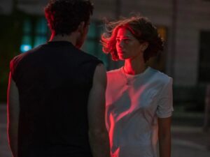 Mystère qui, assez vite, se dilue. La moiteur du désir adolescent, discrètement, infuse l’atmosphère rigide de la communauté paroissiale. La caméra de Carmen Jaquier filme obstinément les nuques courbées des villageois⸱es vêtu⸱es de noir, priant à l’église, manifestant classiquement la rigueur de leur vie religieuse ; seuls les visages de trois jeunes hommes se retournent pour jeter un œil sur Elisabeth, la sœur du « malin », vêtue d’un bleu virginal. Dans des ruines au sommet d’une montagne, Elizabeth observe plus tard la sexualité orpheline de ces trois garçons, abandonnés à un onanisme collectif, les yeux fermés, rêveurs ; dans cette position voyeuriste, la religieuse découvre pour la première fois la langueur de corps désirants. Informée des relations sensuelles qu’entretenait sa sœur défunte avec ces garçons, Elizabeth subit par la suite leur attitude menaçante. Dans une éphémère échappée nocturne près d’un grand bûcher, l’apparition de ces garçons affublés de masques grotesques vient hanter les rêveries de la jeune femme. Mais ce détour par les apparences d’un folk horror (presque de mise) n’est qu’une fausse piste. Le sujet du film est bien le désir, l’affirmation des potentialités sensuelles d’un corps par sa rencontre avec un autre.