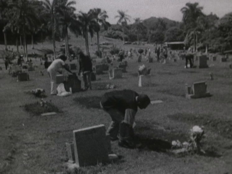 Canal Zone (1977) se positionne comme l’une des preuves les plus évidentes de ce désir de mettre en scène la naissance d’un pays, filmant la vie des résidents civils et militaires du Canal de Panama, encore sous autorité américaine. Le canal (telles les montagnes d’Aspen) prend la forme d’une Amérique ex-nihilo, « nouvelle nation » ayant besoin de cette quotidienneté pour se justifier d’exister, d’être la condition de la paix et de la liberté. Le film se conclut pendant le Memorial Day, où sont célébrés ceux « morts pour l’avenir », entre cérémonies patriotiques et religieuses. Apparaissent alors les à-côtés des drapeaux américains : le regard des Panaméens, qui fleurissent et nettoient leurs propres tombes, eux dont la fiction a été laissée hors-champ par la fiction américaine. Une croyance religieuse, donc, revenant sans cesse structurer le mythe, à travers une séquence de sermon ou de cérémonie collective – quand on ne l’attend pas, la voilà qui surgit pour nous rappeler de nous oublier devant Dieu (Hospital).