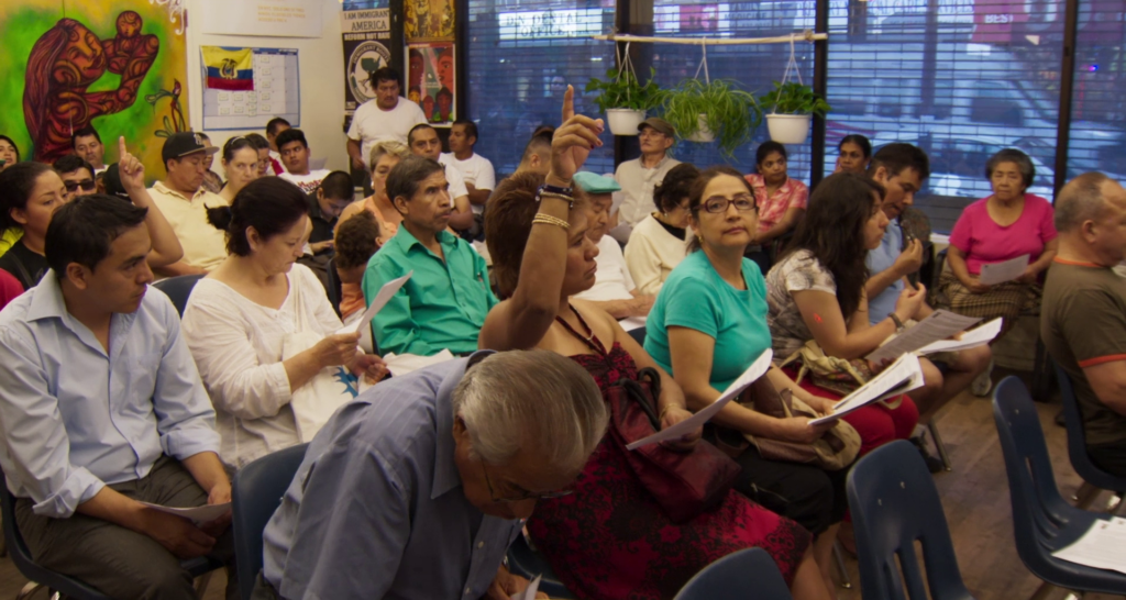 Ses derniers films en apparence œcuméniques ont constitué des poches de résistance collectives, en particulier In Jackson Heights et Ex Libris : The New York Public Library. Une résistance loin d’être béate, ramenant au premier plan les politiques de gentrification et la difficulté à repenser la cohabitation communautaire en Amérique. Au début du premier film, qui prend racine dans la communauté la plus diversifiée du monde, le Queen Center for Gay Seniors se réunit (cette fois dans le Centre juif) pour aborder sa quête d’un hébergement – « Je voudrais un espace à moi », souligne l’un d’eux. Ses membres font part de leur crainte, mais surtout de leur volonté de rester à Jackson Heights, de faire partie de ce tissu multiculturel (le montage enchaîne en ouverture salle de prière musulmane, centre juif, communauté LGBT). Toutes les associations et les organisations sont à la recherche de lieux et d’espaces à investir qui ne seraient pas sous la menace d’une prise de pouvoir par les industries capitalistes. Nul angélisme puisque dans une institution de culture et d’échange comme le réseau des bibliothèques publiques de New-York, l’histoire remonte toujours à la surface pour rappeler la profondeur temporelle du territoire (à l’image des palourdes fossilisées dans City Hall, restes de l’époque post eaux glaciaires de Boston), en témoigne l’une de ses premières séquences, où une jeune femme cherche le lieu d’origine de naissance d’une personne juive en Europe. Le réseau n’est pas une puissance abstraite, il vit par et pour la communauté, justement afin de faire face aux questions raciales. Au Macomb Bridge Harlem, les résidents du quartier insistent sur la nécessité de disposer de documents qui racontent leur vraie histoire, pour contrecarrer la propagande de manuels où les esclaves noirs-américains sont dépeints en travailleurs immigrés. L’histoire, par ses traces inévitablement perceptibles, s’affirme tel un enjeu central qu’il apparaît nécessaire d’investir en tant que citoyen.