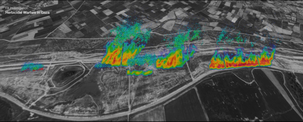 Dans « Some sketches on vertical geography » (2016), le géographe et plasticien Trevor Paglen propose de regarder la construction du monde (world-making) et des infrastructures humaines sur un axe vertical, du « forage en eaux profondes et des câbles sous-marins à l’espace stratosphérique, voire interstellaire »[22][22] Trevor Paglen, “Some sketches on Vertical Geography”, 2016, en ligne sur e-flux.. En Palestine, il n’est pas un jour sans que la tridimensionnalité ne s’impose d’une façon ou d’une autre comme une dimension fondamentale de la colonialité. Pas un jour sans que les réseaux déployés à la surface du sol ne communiquent avec ceux, souterrains, des tunnels, des égouts, des nappes phréatiques, et des gisements de gaz au large de la bande de Gaza. Symétriquement, le contrôle du ciel devient de plus en plus manifestement un enjeu décisif du contrôle des territoires et des populations. Le groupe de recherche Forensic Architecture a produit plusieurs enquêtes vidéo sur la guerre atmosphérique menée par Israël, en montrant que l’utilisation de « nuages » de phosphore blanc et d’herbicides contribuaient à une forme de colonisation aérienne par pollution. Même lorsqu’il n’est pas contrôle exclusif du sol, le colonialisme peut s’insinuer jusque dans les poumons.