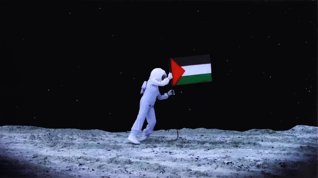Les films de Sansour provoquent un déplacement des partages esthétiques créés par la situation coloniale. Les Palestiniens sommés de documenter leur propre existence et de prouver leur appartenance à la terre deviennent à leur tour les fabricants de fausses archives, de faux restes archéologiques, de fausses ascendances : ils accèdent en somme à ce worldbuilding qui était jusqu’alors le privilège d’Israël. De la même façon, Nation Estate met en scène une esthétique monumentale évoquant un brutalisme high-tech, comme pour inverser le différentiel technologique[77][77] Sur l’importance du « différentiel technologique », en particulier en ce qui concerne l’exploitation des ressources fossiles et l’armement, dans la genèse et la perpétuation de la domination coloniale sur la Palestine, cf. Andreas Malm, Pour la Palestine comme pour la Terre : les ravages de l’impérialisme fossile, 2025. Les célèbres affiches de propagande sioniste des années 1930 invitant à « Visiter la Palestine », à peine modifiées, deviennent la célébration d’une nation palestinienne et d’un mode de vie « en hauteur ». C’est un détournement méthodique des formes visuelles de la colonialité, depuis l’architecture jusqu’aux codes de communication, en passant par la production industrielle de produits pseudo-artisanaux et pseudo-traditionnels. Ce jeu avec les formes dominantes vérifie cette remarque de Jean Genet : « La patrie est l’idée la plus sotte qui soit, sauf pour ceux qui en sont privés, comme les Palestiniens. »[88][88] Cité dans Mahmoud Darwich, La Palestine comme métaphore, Actes Sud, 1997, trad. Elias Sanbar et Simone Bitton. Le récit patriotique mythifiant acquiert, dans le cas de la Palestine, une force subversive : il projette dans le futur ce qui semble voué à disparaître[99][99] On pourrait dire que ce renversement spéculatif de l’imaginaire de mort et de ruines du colonialisme est une caractéristique générale de ce que certain·e·s chercheur·euse·s nomment les « futurismes indigènes », cf. notamment Lindsay Nixon, “Visual Cultures of Indigenous Futurisms”, 2020 et Konak K. Kapadia, Security and the Queer Life of the Forever War, 2019. Que la Palestine puisse ainsi « monter à l’assaut du ciel » [1010][1010] Lettre de Marx à Kugelmann à propos de la Commune de Paris, 12 avril 1871., c’est peut-être l’un des seuls récits qui puisse, malgré tout, prêter à espérer. Car, comme chacun sait, « qui impose son récit hérite la terre du récit ».[1111][1111] Mahmoud Darwich, Ibid.