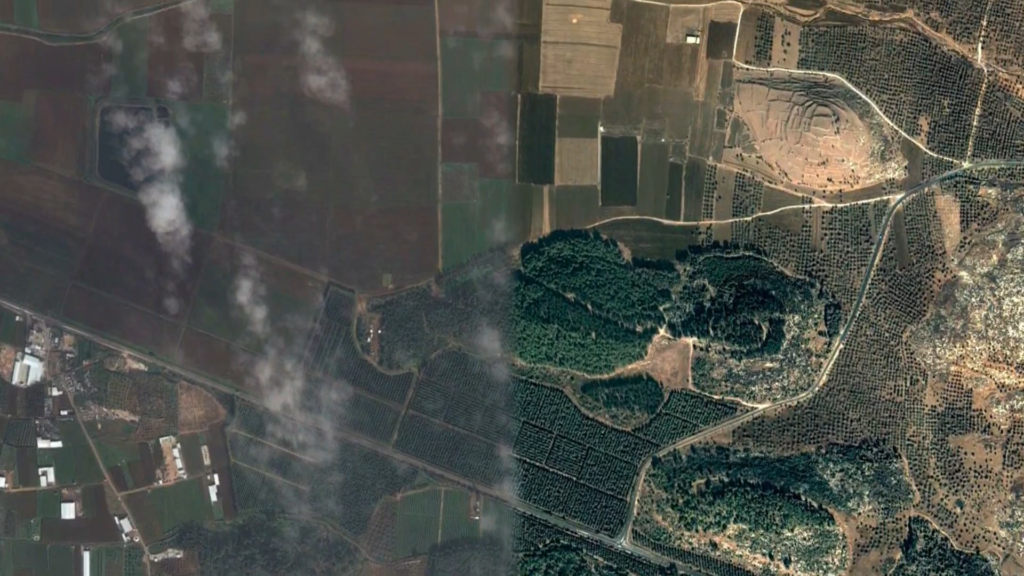 La section « Landscape and Power » de notre exposition nous amène au point où les images du dessus produisent un paysage volontairement flou, dans lequel la cécité n’est plus l’effet involontaire du regard colonial mais l’arme qui soutient sa domination : en 1997, l’amendement Kyl-Bingaman interdit la collecte et la diffusion d’images en haute définition de la vallée du Jourdain et d’autres parties de la Palestine historique. Deux films abordent les conséquences de cet amendement en considérant les photographies par satellite contemporaines comme un moyen de façonner le rapport au territoire. Une vidéo de Forensic Architecture, Destruction and Return in al-Araqib (2017) raconte une collaboration entre chercheurs, activistes et habitants du village d’al-Araqib dans le désert du Naqab. La basse définition permet ici à Israël d’effacer les traces de la présence historique des bédouins : les objets de moins d’un mètre de largeur, et les tombes en particulier, disparaissent entre les pixels. À ces documents étatiques, Forensic Architecture oppose un arpentage photographique collaboratif : un appareil fixé à un cerf-volant permet de reproduire le terrain sous forme de nuage de points, et de vérifier l’évolution du territoire et la permanence des structures villageoises. Dans A Blurry Real Landscape (2021), l’artiste Gian Spina travaille à même les images satellites pour reconstituer le trajet du Jourdain, du lac Tibériade jusqu’à la Mer Morte, qui marque la frontière avec la Jordanie. Ses cadres sont composés à partir des lignes droites créées par la juxtaposition d’images satellites de différentes résolutions, de différentes colorimétries, et même de différents ciels : alors que le traitement computationnel des images satellites permet aujourd’hui de retirer les pixels de nuages pour obtenir un ciel parfaitement transparent, certaines parties du territoire se cachent sous un ciel couvert. La surface bidimensionnelle et hétéroclite de la carte évoque la peinture moderne, mais une peinture dont les surfaces monochromes et l’agencement géométrique seraient avant tout des symptômes : « disjonctions » du paysage et du ciel lui-même pour un peuple lui-même « disjoint » (dislocated).