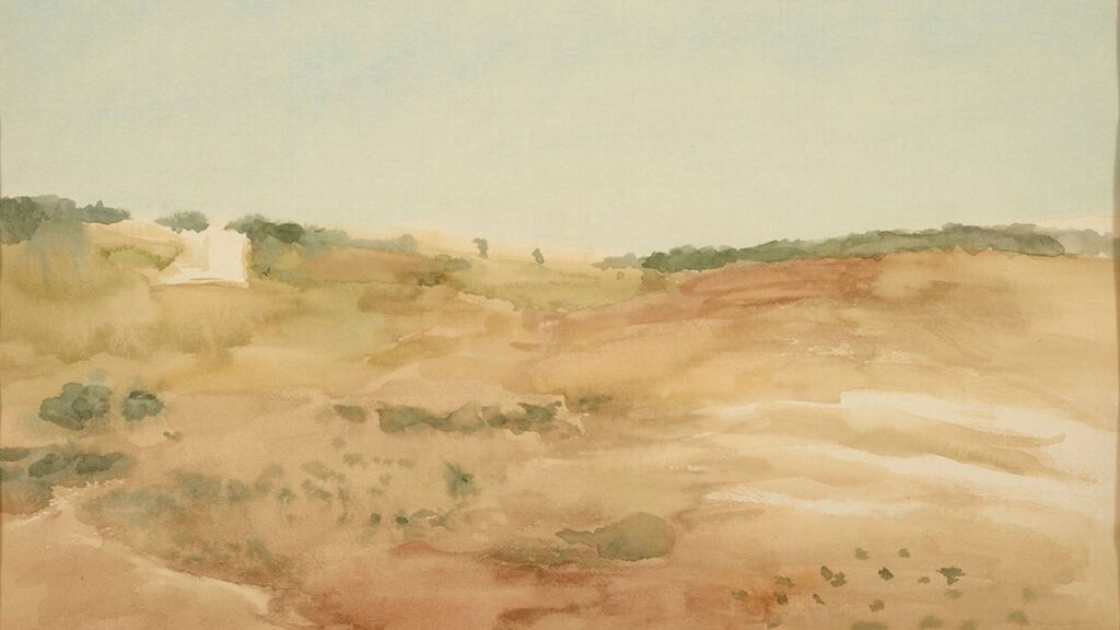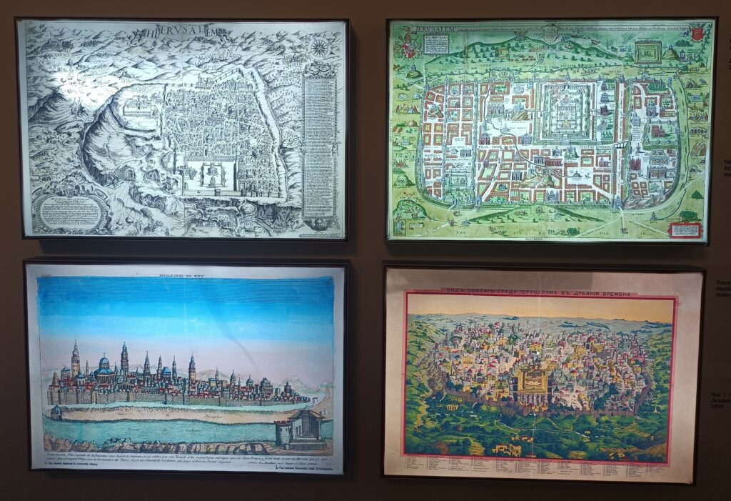 La section « Representing Jerusalem » explore les représentations de la ville « trois fois sainte », saturée par l’imaginaire biblique. Les représentations cartographiques réunies dans l’exposition, qui vont du VIème au XIXème siècle, montrent Jérusalem sous différents angles et selon des principes de perspective extrêmement variables. C’est que la cartographie, médiévale comme moderne, est plus intéressée par l’importance spirituelle de la ville que par sa description objective. Paradoxalement, la ville éternelle apparaît donc comme une ville anamorphique, transformée exagérément d’une carte à l’autre, sans cesse distordue par une représentation qui ne s’est pas encore systématisée. En regard de ces cartes, l’exposition propose un aperçu de la « disneyification » contemporaine de la ville à partir de représentations tridimensionnelles, depuis le Holy Land Model de Michael Avi-Yonah, maquette de 1:50 construite pour le directeur du Holy Land Hotel en 1966 sur le modèle de la Jérusalem biblique, jusqu’au Holy Land Experience Religious Theme Park à Orlando, en Floride, qui permet de voir la vie du Christ sans avoir à se déplacer jusqu’en Israël-Palestine. À rebours de ces représentations bibliques, qui abstraient Jérusalem de l’histoire pour la projeter dans le ciel, les aquarelles de Sophie Halaby, peintes au début du XXème siècle, offrent une alternative terrestre. Ses vues de Jérusalem et de ses alentours introduisent une économie de moyens et une forme de pudeur (la ville y est presque toujours représentée de loin, débarrassée du pittoresque et du spectaculaire des peintures romantiques orientalistes) qui donnent à l’inverse le sentiment du transitoire et d’un quotidien prosaïque.