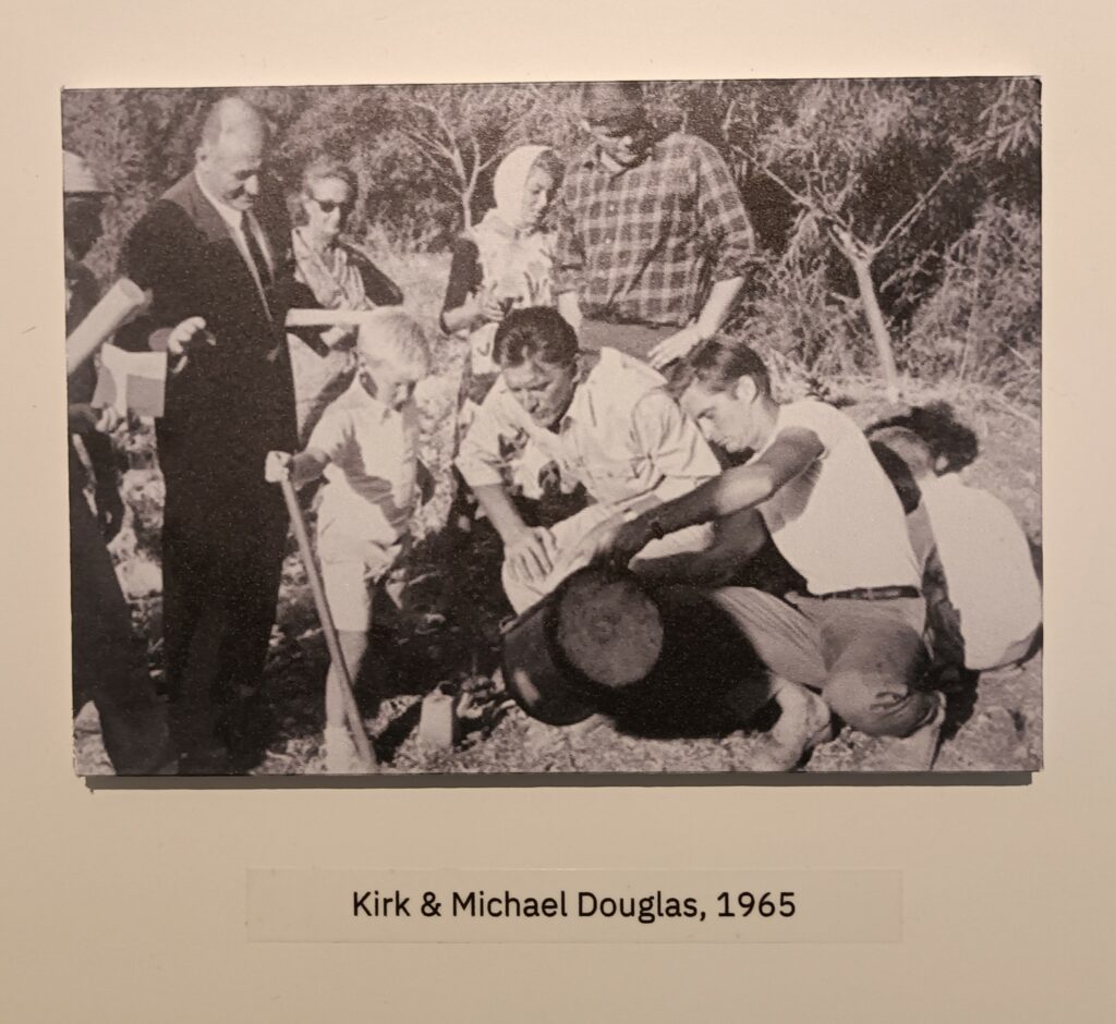 L’histoire de l’urbanisme et de l’aménagement d’Israël est elle aussi liée aux représentations religieuses de la Terre. La section « Landscape and Power », met à l’épreuve l’idée d’une « Terre sans peuple » (selon la formule attribuée, selon les sources, à Alexander Keith ou Lord Shaftesbury : « A land without a people for a people without a land. ») et revient sur la fabrication de cette terre biblique figée dans son éternité. Une table d’archives photographiques des années 1960 raconte la création des parcs naturels : les ruines de villages palestiniens balayés par les tractopelles cèdent la place aux forêts de pins, dans l’idée de reconstituer l’image de la Terre Promise. L’aménagement du territoire s’apparente à une reconstruction complète du monde à partir de coordonnées imaginaires, sorte de worldbuilding destiné à remplacer le monde existant. Kirk Douglas, qui tourna le premier film américain en Israël, et son fils Michael, sont photographiés en train de mettre la main à la patte…