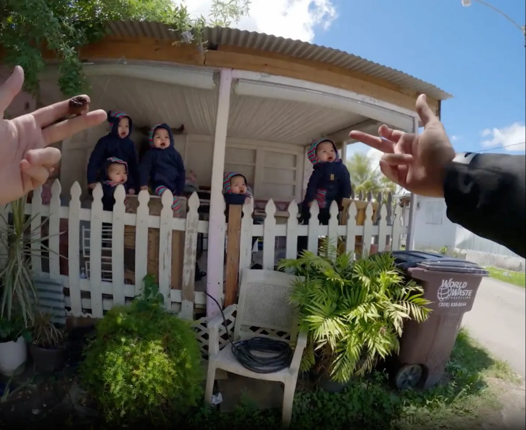 Les visages générés par IA, les textures instables, les décors vides : autant de signes d’une esthétique post-réelle où l’image ne masque plus son artificialité. Baudrillard avait déjà décrit ce type de mutation de l’image devenue « pure simulation » – et Korine en donne ici une version extrême. Le masque de bébé n’est pas un déguisement mais le visage par défaut d’un monde post-humain, où l’émotion semble greffée comme un plugin. On pense également aux émojis « pleurs » et « mort » qui s’affichent au centre de l’écran pendant la séquestration d’une famille dans la villa. Cette intervention graphique se combine avec le chat multilingue qui défile en direct sur la gauche de l’écran, commentant les actions perçues en temps réel : se demandant de quoi il s’agit, faisant des références aux thrillers des années 1990, ou signalant leur rire et leur stupeur.
