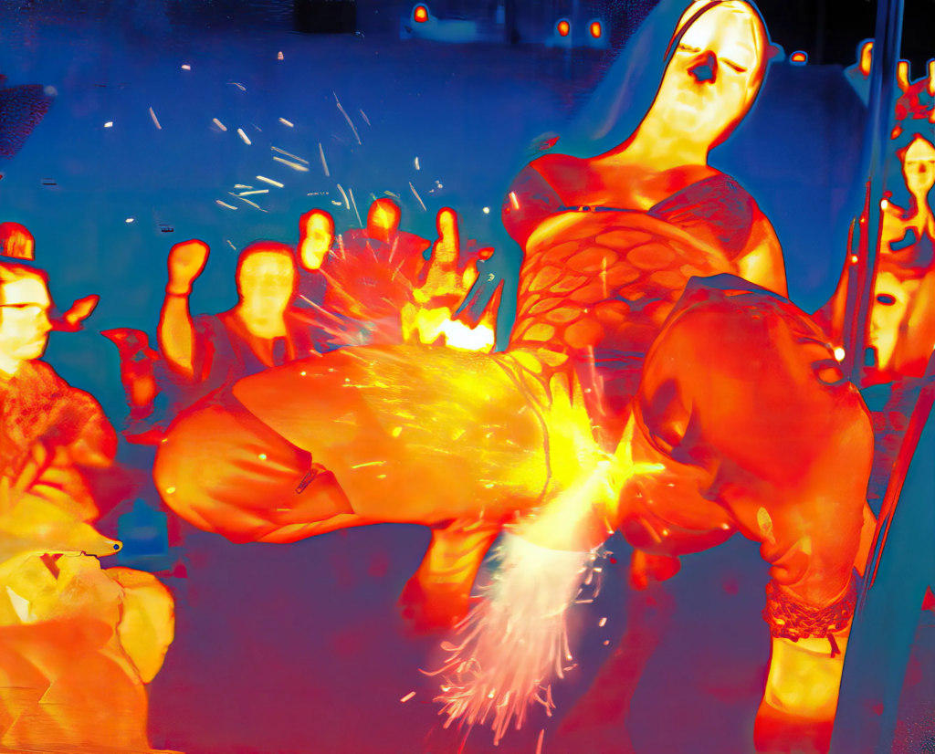 Et pourtant, quelque chose comme une émotion persiste, fragile, résiduelle – une mélancolie spectrale qui hante les surfaces trop lisses de cette perception machinique. Dans Aggro Dr1ft, les beats syncopés et les pulsations électroniques répétitives d’AraabMuzik organisent l’énergie même de l’image thermographique : un drop peut entraîner un changement de couleur. Chaque pulsation, chaque texture abrasive agit comme un vecteur d’intensité, impose un rythme plus nerveux et mécanique, strident et cauchemardesque, où l’émotion naît aussi de l’excitation et de la tension accumulées dans le flux (contrairement à Baby Invasion, on attend un climax). Dans Baby Invasion, au contraire, le résidu affectif ne s’impose pas comme un sentiment clair ou dirigé, ni comme une poésie du sens, mais comme une poésie du signal, du fantôme numérique, du souvenir corrompu. De là émerge une beauté fragile, qui touche non pas par adresse, mais parce qu’elle se greffe comme une mémoire étrangère à la nôtre.