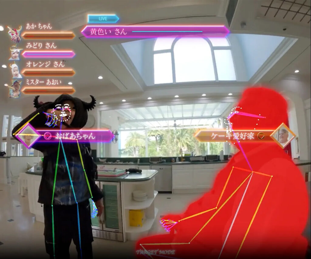 Cette apparition inaugurale est la première véritable occurrence (dé)générative, où l’artifice se donne d’emblée comme artifice. Il rejoint ensuite ses complices dans le crime, aux têtes aussi artificiellement générées. Ensemble, ils chargent des armes dans un fourgon, écument les rues de Miami et prennent d’assaut une villa. Tout au long du film, des personnages masqués apparaissent également de manière ponctuelle, dans une fenêtre en haut de l’écran, sans que l’on sache vraiment s’il s’agit de joueurs ou de spectateurs.