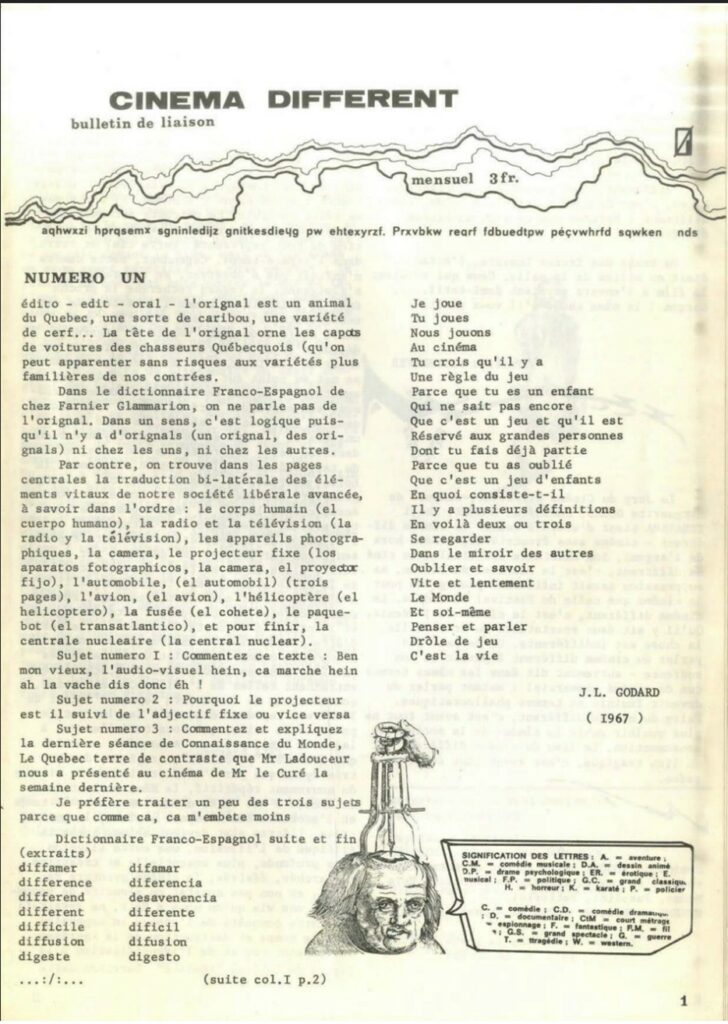 D. : Il est en effet rare de voir des volets jeunes dans le monde du cinéma expérimental. Tu parlais de public vieillissant et je m’interroge sur ce paradoxe entre la niche que représente la forme expérimentale et l’exercice de sa diffusion. Cinquante ans après, vous perpétuez l’esprit en dehors des lignes qu’avait revendiquées le cinéaste Patrice Kirchhofer dès la première page du premier numéro de la revue du CJC, « Cinéma différent ». Introduction dans laquelle il affichait un poème de Godard qui s’attaquait à ceux qui n’interagissent plus avec le cinéma comme le feraient des enfants.