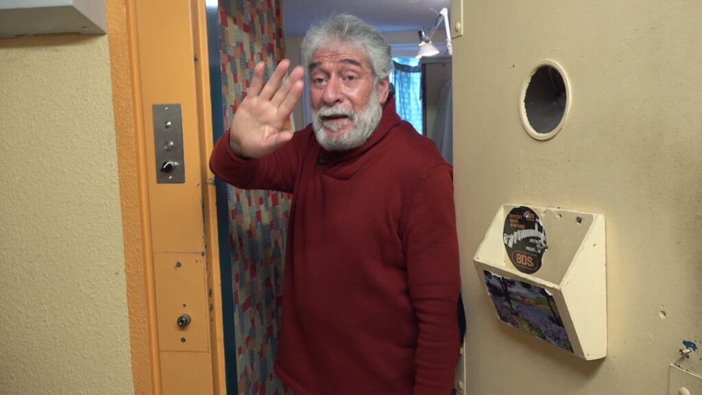 L’Affaire Abdallah, comme tout film de Pierre Carles, est un film sur l’intégrité. Une intégrité qui s’incarne tout d’abord dans la figure de Georges Ibrahim Abdallah, communiste anti-impérialiste, ancien leader des Fractions Armées Révolutionnaires Libanaises (FARL), plus vieux détenu de France jusqu’à l’été 2025, record de longévité en prison depuis l’abolition de la peine de mort, accusé d’avoir fomenté trois assassinats politiques en 1982 qu’il a toujours refusé de condamner. Si Abdallah reste en prison, c’est, selon les tribunaux et les gouvernements successifs, parce qu’il n’a pas changé d’opinion. Et quelles opinions : l’ouverture du film, une visite de la députée européenne Rima Hassan que le cinéaste accompagne, montre des gros plans de tous les stickers continuant de dénoncer la colonisation israélienne de la Cisjordanie et le génocide à Gaza. Le militant, qui ne prend la parole que pour se positionner, est séparé de nous par nombre de portes dont Carles filme chaque franchissement. Cet effet de seuils correspond à toutes ces manifestations qui, depuis la fin de la période de sureté du militant au début des années 2000, se déroulent devant les grilles de la maison d’arrêt de Lannemazan (Hautes-Pyrénées) et que Carles a couvertes [11][11] L’ancien journaliste est aussi l’auteur d’articles en soutien au militant dans les pages du Monde diplomatique.. La visite permise par Rima Hassan, première eurodéputée palestinienne, donne accès à une image confisquée depuis la première incarcération de Georges Ibrahim Abdallah : le rapport direct et intact avec ce militant.
