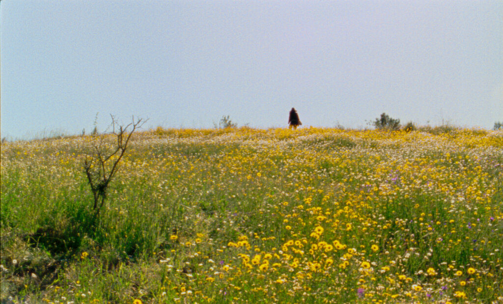 Composé d’une manière non linéaire, le film fonctionne selon une logique de dissémination, d’échos. S’y agrègent différentes temporalités : le présent du tournage, le temps imaginaire des mythes paysans, les années 40 des archéologues, la dictature de Salazar et les luttes, qui toutes persistent dans l’espace sillonné par la caméra. Au sein de ce maillage, les traces se superposent : l’écrit, la parole, l’image, autant de signes qui créent une architecture temporelle. Une chèvre renvoie à la jeune fille d’une légende, un dolmen à un archéologue, un archéologue à la guerre, la guerre à la dictature et la dictature à la résistance, la résistance à la légende d’un bandit résistant et de ce bandit à la coopérative, de la coopérative à l’agriculture et de l’agriculture aux saisons, au cycle. Ce mécanisme d’échos est permis par un montage, qui rapproche plutôt qu’il ne relie, qui associe plutôt qu’il ne coupe. La région se présente comme une forêt de signes, l’espace est lourd, lourd de son passé et de son futur ; l’inertie des paysages balayés fait appel à leur saisie. Le temps devient espace, l’espace devient temps [11][11] On pense à Derrida, dans « La différance », qui disait bien comment se constituait le présent, « comme synthèse “originaire” et irréductiblement non-simple, donc stricto sensu, non-originaire, de marques, de traces, de rétentions et de protentions » (in Marges de la Philosophie, Ed. Minuit, p. 14). Les collines piquetées de fleurs jaunes sont balayées pendant que la voix des Leisner lit en allemand la beauté et la destruction.
