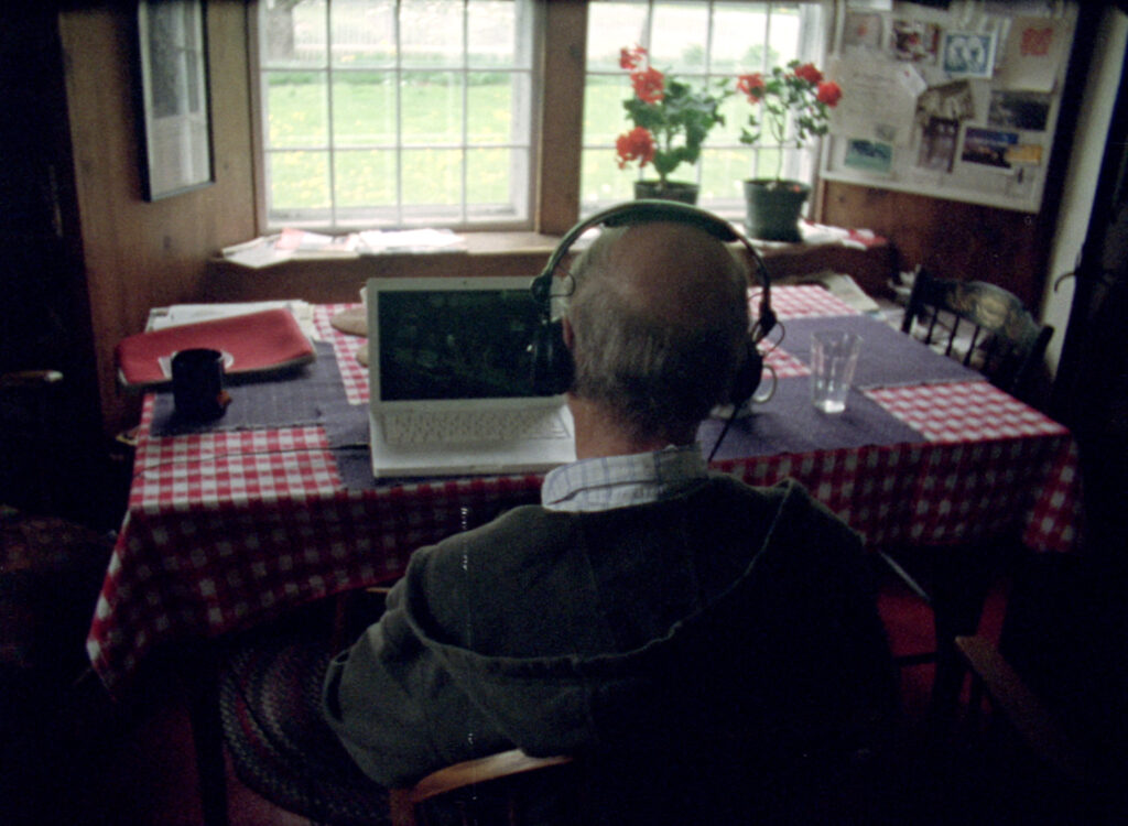 L. F. : J’étais à Dartmouth College, en Nouvelle-Angleterre, quand j’ai rencontré Christian [Wolff]. Il enseignait là-bas, pas la musique, mais la littérature comparée. Je ne voulais pas faire un film sur lui, mais je savais que je le regretterais si je rentrais sans garder une trace de son influence. Alors je lui ai demandé si je pouvais venir filmer chez lui, dans sa ferme. J’ai apporté le film que j’avais fait sur Cornelius Cardew [Pilgrimage from Scattered Points], puisque Christian avait fait partie du Scratch Orchestra dans les années 1970, à Londres. Pendant qu’il regardait le film, je me suis mis à filmer dans sa maison. Je suis revenu une autre fois, et c’est là qu’on a fait l’entretien. Il a trouvé ça drôle parce que, le jour de l’entretien, je n’avais pas pris de caméra, alors qu’il s’était habillé avec une chemise. Quand je l’avais filmé à la ferme, il ne s’y attendait pas du tout, donc il était en hoodie, en tenue de travail.