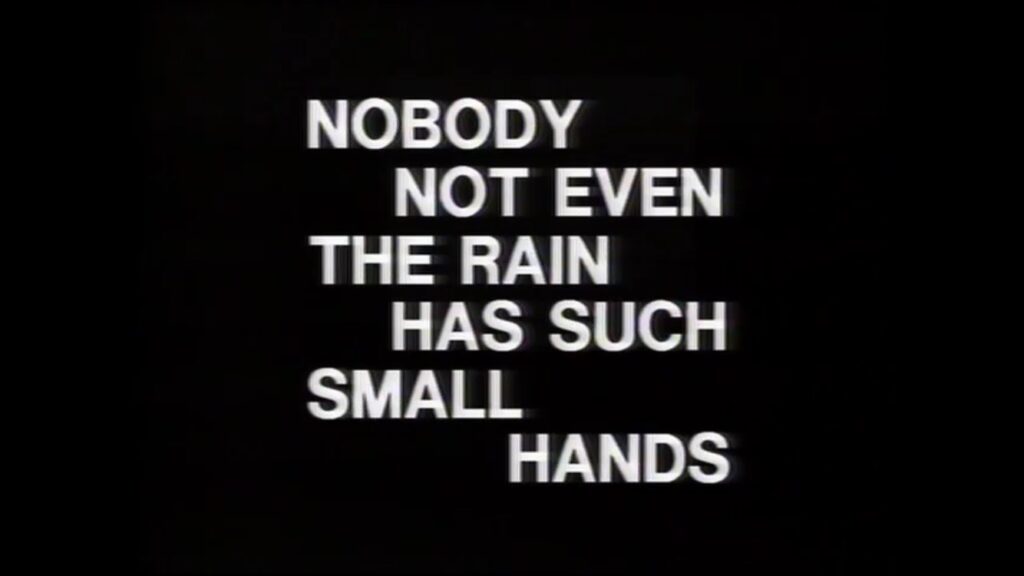 ● n Remains there. Toys for a long time with an object. Starts to leave, then stops, puzzled, comes back a couple of paces, then goes off again. Doesn’t go away, but the camera dollies back. Looks at the camera without any expression as he touches her scarf.»