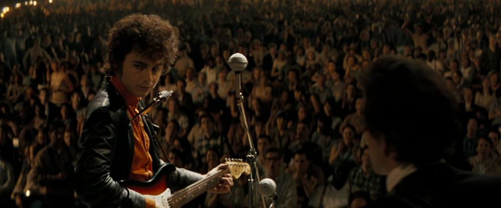 À partir de l’unique captation de sa séquence « mythique » qui doit encapsuler tout un bouleversement de la musique moderne (« la nuit qui a tout changé » nous dit le sous-titre du livre de Wald), Mangold se lance donc dans un jeu de doubles et de différences (qui est aussi recoupé par d’autres témoignages des personnes présentes mais on note de manière assez évidente que certains gestes sont repris à l’identique ; le reste des récits rempli ce qui se passe en coulisses, derrière et en parallèle de l’image connue), s’amuse à retourner la caméra, trouver le hors-champ. A la fois celui, évident de la scène dans les réactions plus ou moins enthousiastes suscitées par le concert mais aussi interne à l’image documentaire, le hors-champ dans le champ, si Dylan a été filmé de dos, on verra Chalamet de face, etc., dans une mise en profondeur de l’image, véritable jeu de miroir et de point de vue. Mangold d’une certaine manière dézoome et éclate ces images initiales pour y réinsérer une dramaturgie puisque ce jeu de miroir se redouble aussi narrativement, la séquence fonctionnant comme une mise en miroir, continuation et divergence de la précédente séquence à Newport de The Times They’re A Changin’ en reprenant les mêmes protagonistes ou presque (Johnny Cash, Pete Seeger et son épouse, Joan Baez, son équipe, les organisateurs du festival) et travaillant la portée collective du geste dylanien. Dans une alternance de regards complexes (qui se divisent entre la scène, l’arrière scène et le parterre) Dylan devient le point de focalisation entre adhésion et désadhésion, toujours au centre même lorsqu’on ne le voit pas.