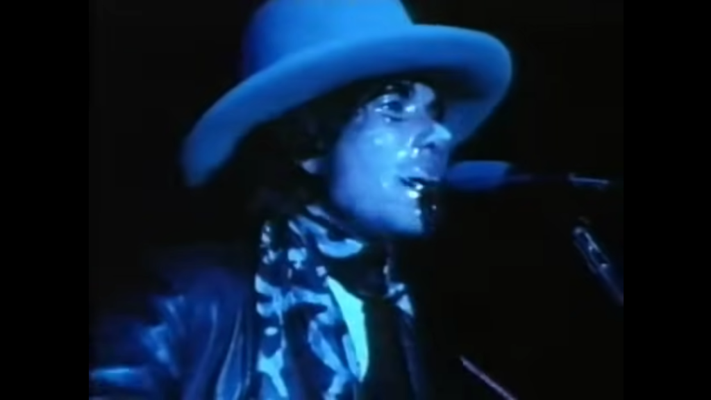 Cette présence en dehors/en dedans se relie aussi à la propre présence artistique de Dylan, qu’elle soit musicale ou cinématographique. Image de cinéma abondante, celui-ci a habité le médium de manière paradoxale, du documentaire de Donn Alan Pennebaker, Don’t Look Back (1965) qui le suit lors de sa tournée britannique de 1965 à travers hôtels et salles de concert à sa « réponse » dylanienne, Eat the document (« sorti » en 1972, et filmé en 1966 lors d’une autre tournée) faite de chutes et de rushs d’un second film que Pennebaker ne fera pas, anti-documentaire selon la volonté de Dylan qui vise à « dévorer » le médium comme son titre l’indique. Son film suivant, Renaldo & Clara (1978), fabriqué pendant la tournée « Rolling Thunder », s’ouvre sur le chanteur dissimulé derrière un masque transparent. Dans une opacité ambivalente, une forme de défiguration, Dylan entend dissoudre sa figure dans les strates de sa transparence. Le film dans sa narration hybride (alternant les vignettes, les interviews informelles, les concerts…) est une suite de masques et de jeux, jeu de rôles (Dylan joue Renaldo et fait jouer Dylan par quelqu’un d’autre) qui empêche cette impossibilité d’approche univoque. On peut aussi penser aux velléités warholiennes de Dylan qui souhaitait un film qui capterait sa vie 24h/24h (l’ambition initiale du film avorté avec Pennebaker et qui se retrouve un peu plus dans Renaldo & Clara dont la durée de 4 heures en impose). Mais ce désir de captation absolue, d’une certaine forme d’exhaustivité se traduit paradoxalement par un certain vide, ne sert pas un projet de clarté de l’artiste vis à vis de sa personne et de son oeuvre que le biais d’un autre cinéaste aurait pû altérer (Eat the document par exemple a de quoi être décevant). Série de médiations et de reflets qui s’inter-réfléchissent, s’échangent et mutent, cette distorsion mise en miroir se manifeste aussi dans sa voix. L’objet voix dylanienne, particulièrement reconnaissable dans sa tessiture limitée et son nasillement certain est moins prise en compte que ses textes dans l’approche habituelle de l’artiste. Elle est par ailleurs absente du film de Mangold, concrètement puisque Chalamet chante lui-même (de manière assez convaincante) et réflexivement puisque celle-ci devient dans le même mouvement un autre élément parmi d’autres (les ongles noircis par exemple), de l’imitation d’un être finalement assez figée, sans que le cinéaste y propose quelconque aspérité. Mais sa voix est aussi sensible, propre aux variations et changements (devenue ponctuellement assez méconnaissable dans son album Nashville Skyline en 1969 où le chanteur pousse celle-ci dans des roucoulements plus crooner). Dylan utilise son organe vocal comme outil de défiguration, marque d’un vieillissement, d’une usure, tirée, épuisée rendue discordante dans les cris de la plupart de ses concerts où celle-ci se mue en hurlements, grognements, marmonnements d’un texte métamorphosé et dévoré (textes eux abondamment peuplés et mouvants dans des chansons de plus en plus longues, qui s’enroulent sur elles-mêmes et abondent, débordent dans tous les sens, ne pourraient jamais finir[66][66] « Oh, Mama, can this really be the end,/To be stuck […] » et ne jamais s’arrêter de changer).