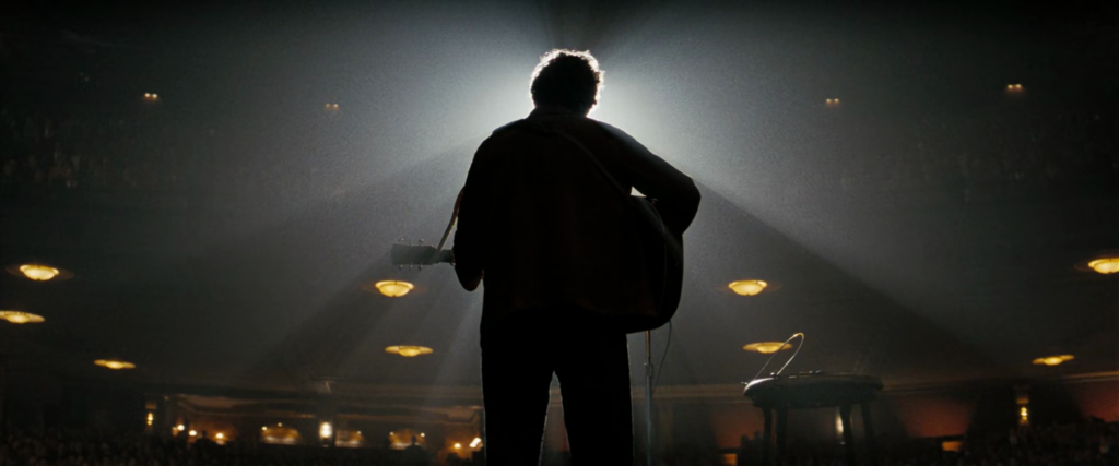 Au milieu de cela, Timothée Chalamet parvient à créer le trouble dans certaines images, comme habité par le fantôme corporel de Dylan qui fait voir double. Alors que Dylan a longtemps marqué les esprits par son visage encadré de boucles brunes, pris blafardement par la lumière d’un flash ou un projecteur de salle (on peut penser à Don’t Look Back, début de l’iconographie cinématographique dylanienne, rien que par son affiche), avec Chalamet, la mise au point avec le modèle finit par se faire lorsque le visage s’efface, s’imagine, se devine, contrechamp de l’icône où Dylan « apparaît », tas de cheveux mousseux un peu enfoncé dans un dos voûté, qui ne « regarde pas en arrière ».