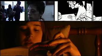 Les vignettes du manga, contrechamp de l’ouvrage que lit Tracey dans la partie inférieure de l’écran, sont remplacées temporairement par le fruit de son imagination suscitée par la lecture, tandis qu’on entend en fond sonore une teenage romance. La séquence déploie ainsi un montage mosaïque fait de rebonds et d’associations mentales, entre trois niveaux narratifs.