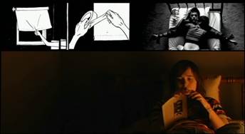 Si ces deux séquences constituent deux pôles opposés (la visite chez le Dr Heker correspondant à une mosaïque statique figée, tandis que la fuite de l’appartement après l’agression déclenche une cascade d’images dans un maelstromsubmergeant), d’autres scènes composites déploient des structures plus complexes et évolutives, fonctionnant selon un principe de résonnance et de transfert. Lorsque Tracey lit un manga dans son lit, les cases de la BD s’alignent dans trois fenêtres formant une bande horizontale en haut de l’écran (Figure 5a-b) : l’héroïne du manga, nue à la porte de sa chambre, dit bonne nuit à sa mère. Billy Zero apparaît alors de manière intermittente dans les cases de la bande supérieure de l’écran. Un jeu d’alternance visuelle se met en place entre les images plus ou moins érotiques tirées du manga de Tracey et le fruit de son imagination : lorsque l’héroïne du manga s’allonge sur son lit, des images de Billy Zero s’allongeant sur un lit apparaissent simultanément. Puis de nouvelles images de Tracey l’y rejoignant prennent place dans les fenêtres, avant que Billy et Tracey ne fassent l’amour. Lorsque l’héroïne du manga occulte les fenêtres de sa chambre avec du scotch, Tracey s’imagine attacher Billy sur le lit de la même manière. Les vignettes graphiques qui occupent le haut de l’écran ont été traitées numériquement afin de les apparenter aux traits simplifiés et contrastés typiques des dessins de mangas.