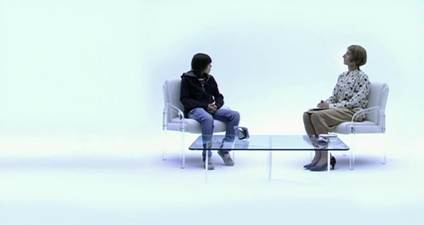 La première visite de Tracey chez le Dr Heker présente la mosaïque compositionnelle la plus stable du film (Figure 2). Les deux personnages dialoguent et la parole circule entre trois fenêtres. Les deux plans serrés de Tracey et du Dr Heker sont liés à des voix synchrones proches et nettes.